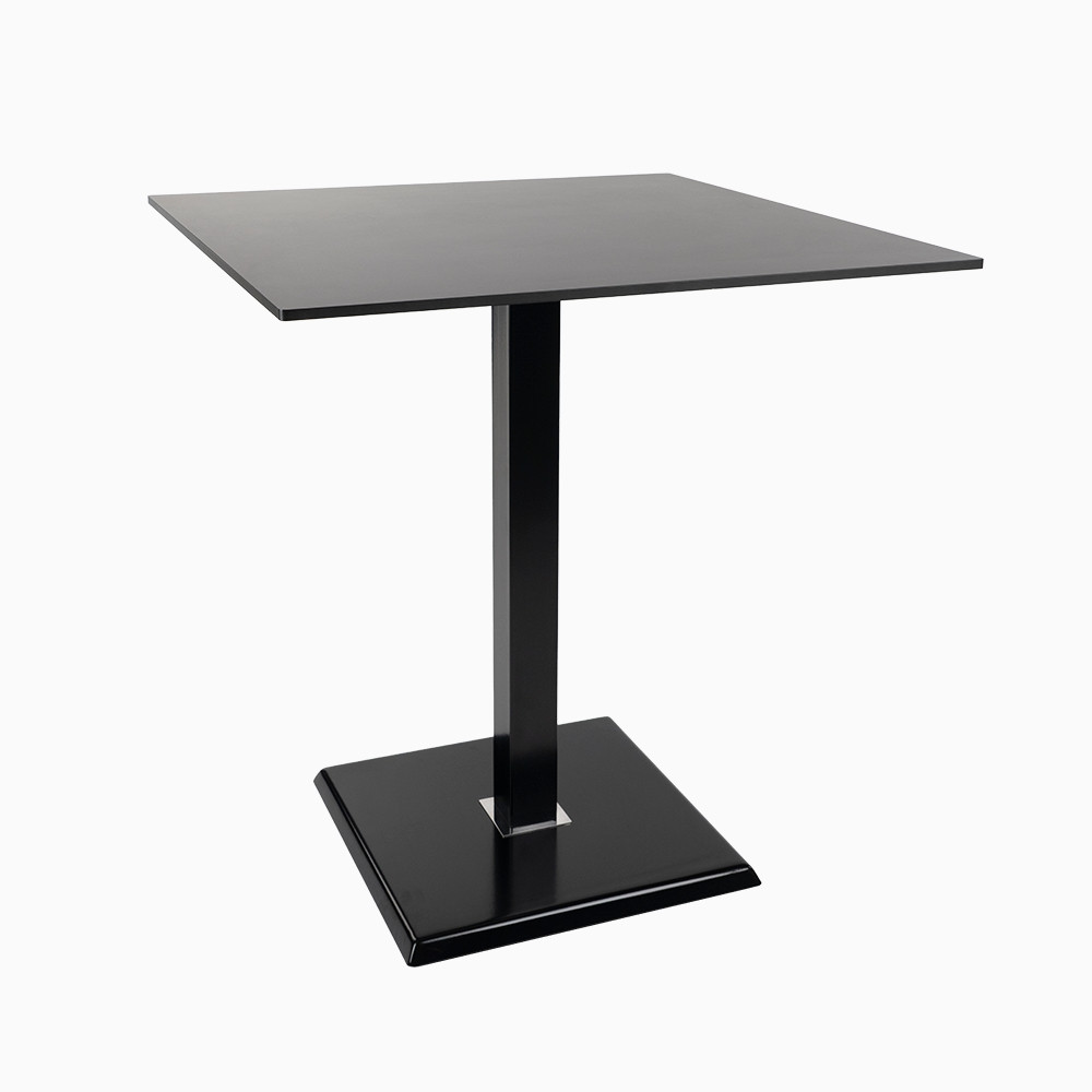 Tavolo con base in metallo verniciato colore nero semilucido e piedini registrabili, impreziosito con particolare in acciaio inox lucidato a mano, colonna in tubo quadro, piano in stratificato bordo piatto