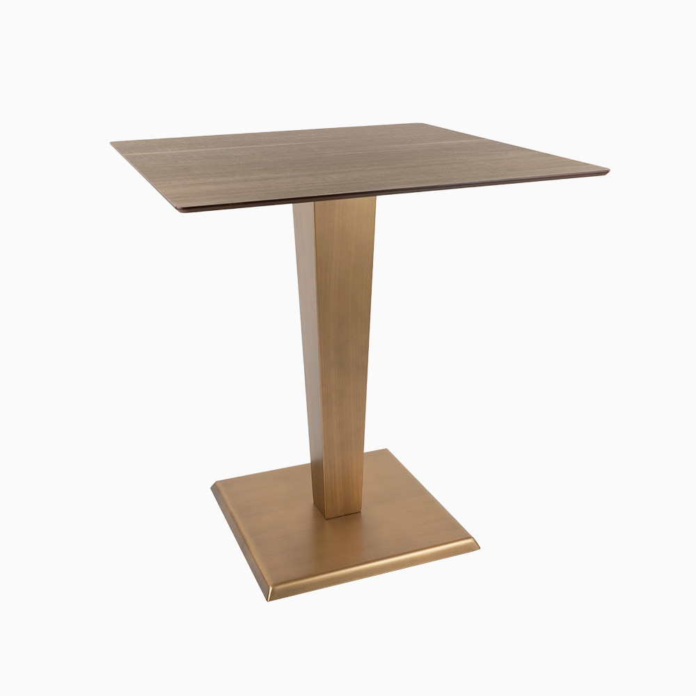 Tavolo con base parzialmente in metallo verniciato oro anticato, piano in stratificato bordo inclinato