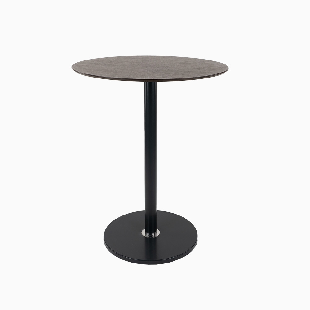 Tavolo con base in metallo diametro 400 colonna diametro 50 verniciato colore grigio scuro, particolare acciaio inox lucidato a mano e piano in stratificato bordo inclinato