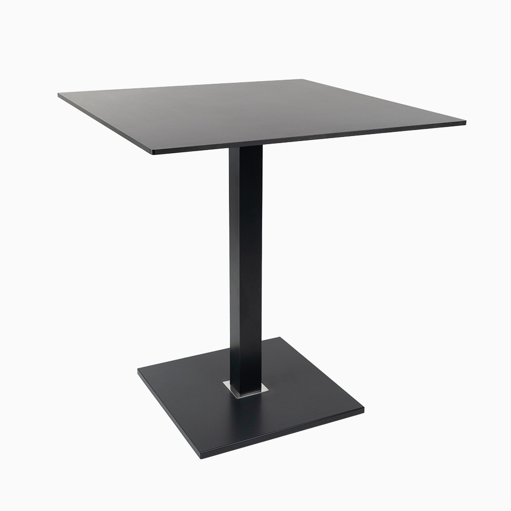 Tavolo con base in metallo colonna quadrata, verniciato colore grigio scuro con particolare acciaio inox lucidato a mano, piano in stratificato bordo piatto