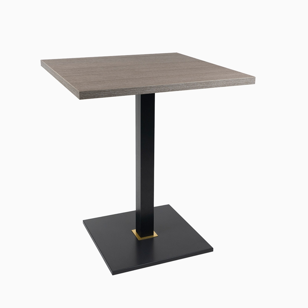 Tavolo con base in metallo colonna quadrata verniciato colore grigio scuro, particolare acciaio inox verniciato colore oro, piano in nobilitato bordo ABS in tinta