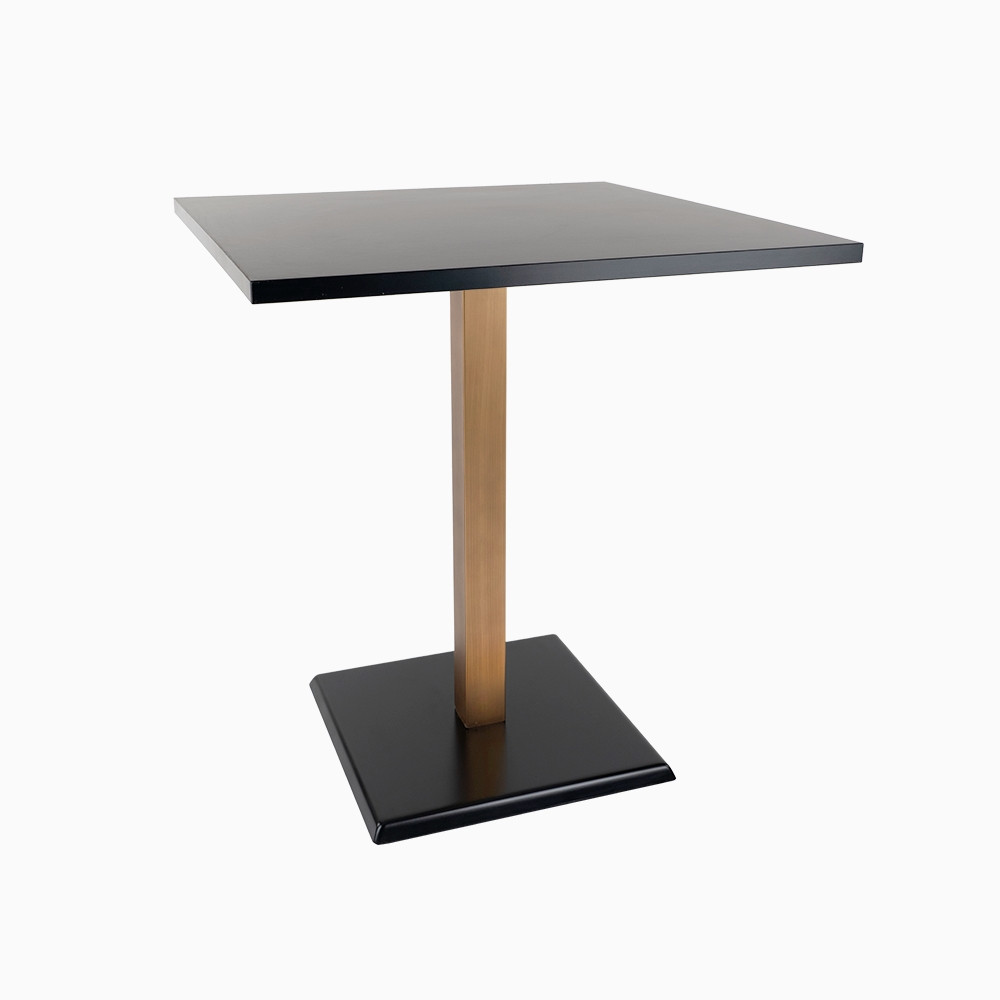 Tavolo con base in metallo e piedini registrabili, verniciato colore nero semilucido, colonna in tubo quadro colore oro anticato, piano in laminato bordo ABS in tinta