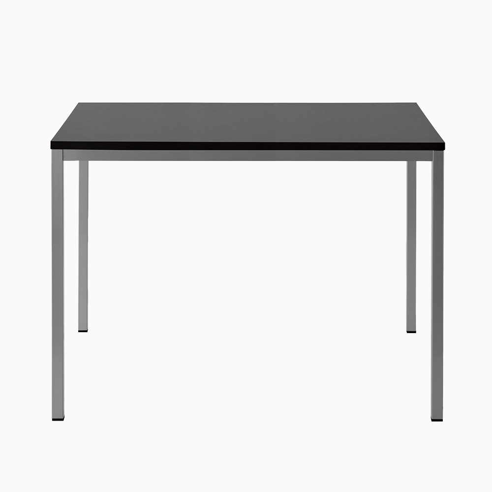 Tavolo con base in metallo verniciato colore cromo, piano in laminato bordo ABS in tinta