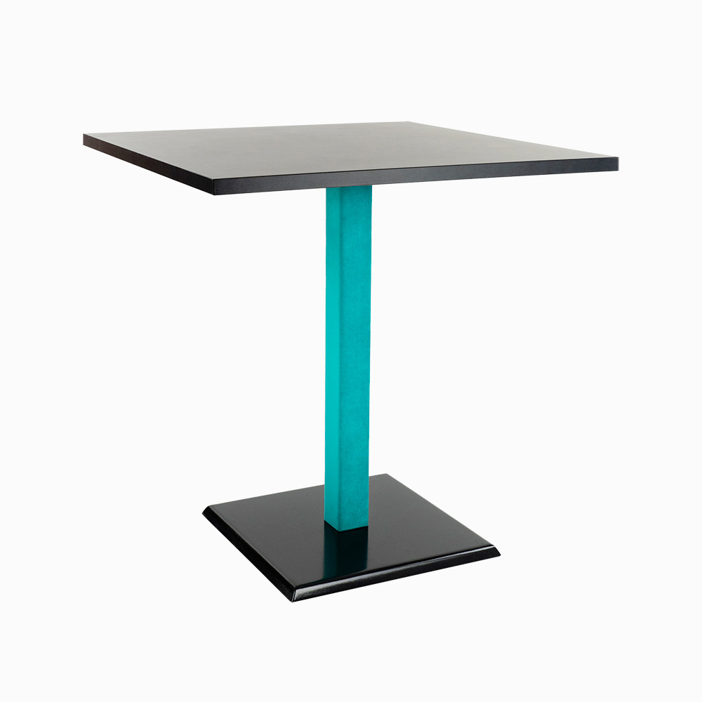 Tavolo con base in metallo e piedini registrabili, verniciato colore nero semilucido, colonna in tubo quadro rivestita in velluto, piano in laminato bordo ABS in tinta