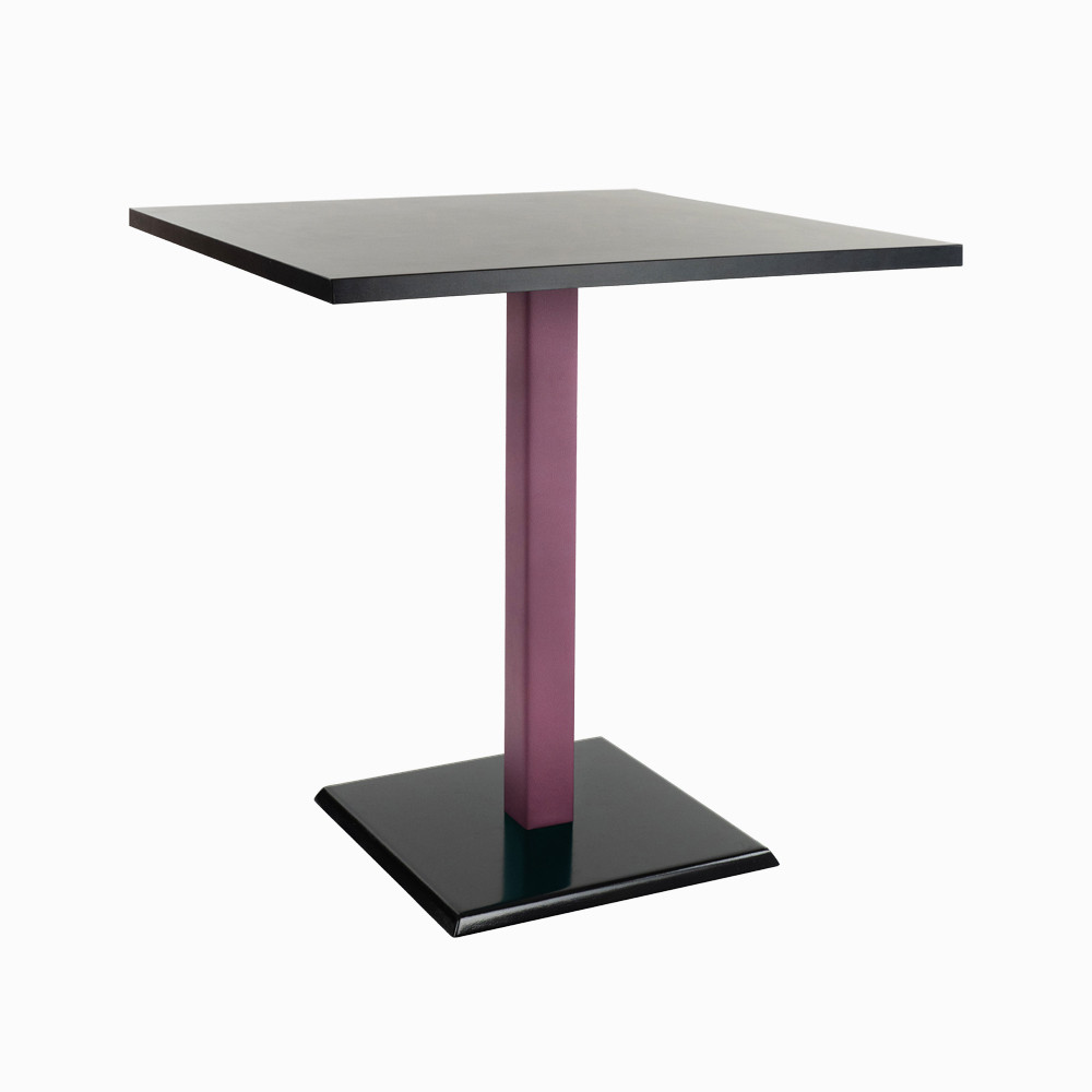Tavolo con base in metallo e piedini registrabili, verniciato colore nero semilucido, colonna in tubo quadro rivestita in eco pelle, piano in laminato bordo ABS in tinta