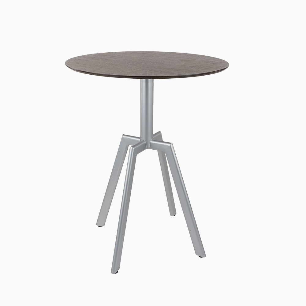 Tavolo tondo con base in tubo ovale verniciato colore cromo opaco, piano in stratificato bordo inclinato