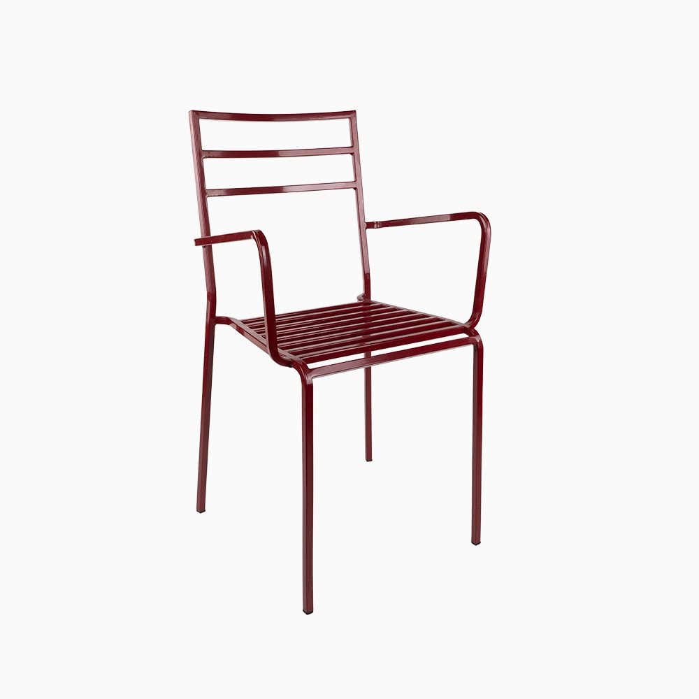 Sedia completamente in metallo con braccioli, trattata con prodotti anti ossidazione, verniciata a polvere colore rosso, adatta per arredare anche spazi esterni